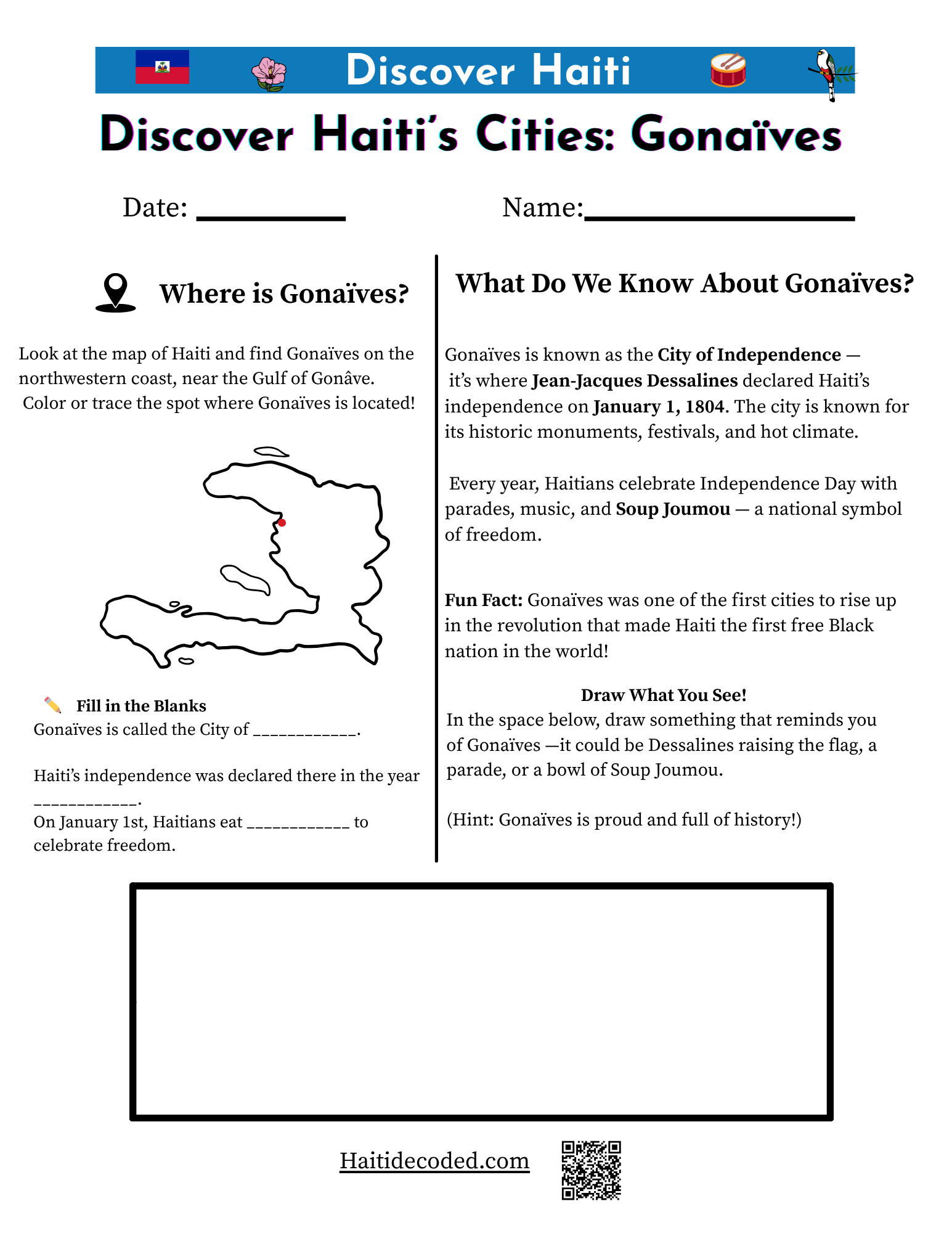 Travel to Gonaïves, the proud birthplace of Haiti’s independence! This free educational worksheet helps children and families explore the historic city where Jean-Jacques Dessalines declared Haiti’s freedom on January 1, 1804. Known for its hot climate, festive parades, and national pride, Gonaïves stands as a symbol of courage and resilience.